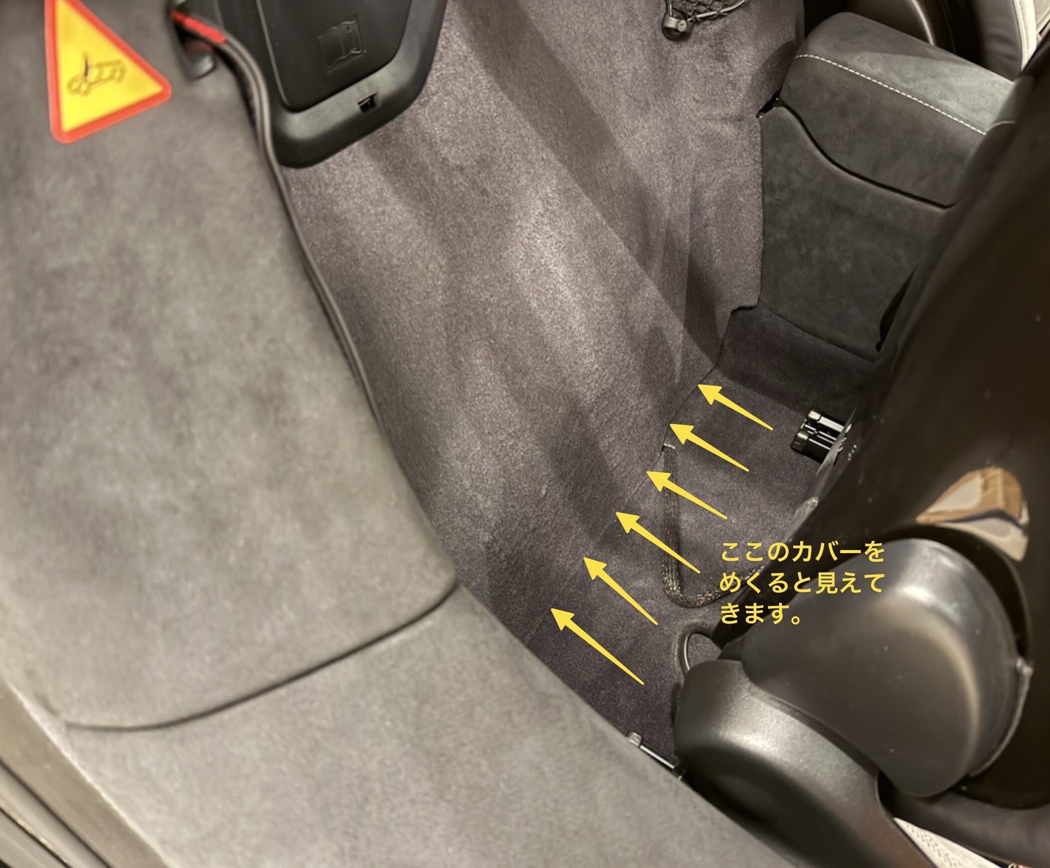 右フロントの足元、マットカバーを剥がしたら見えます。